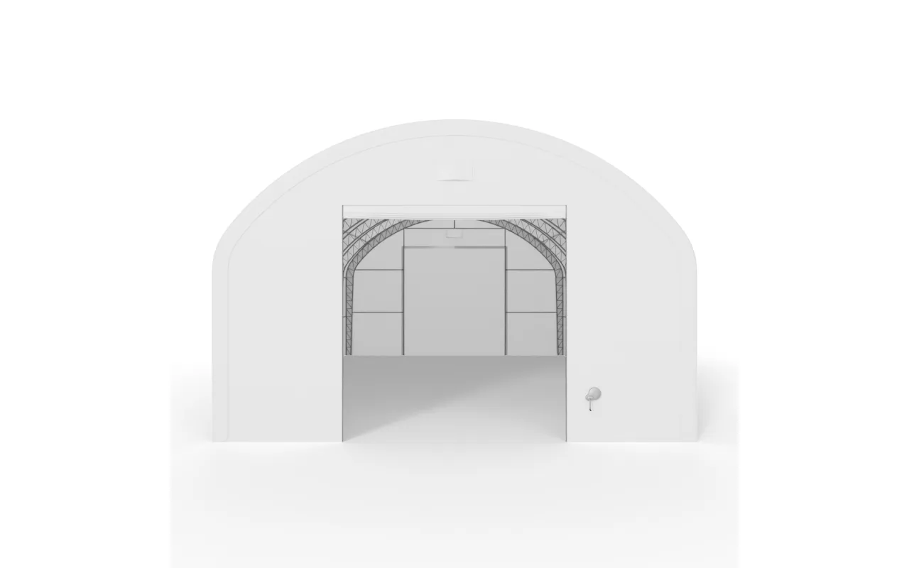 Plachtová hala s vertikálnymi bočnými stenami 12,2x18,3 m PVC 750 g/m² využíva oceľový rám v usporiadaní dvojbodovej priehradovej konštrukcie, ktorý zvyšuje tuhosť celku a uľahčuje bezpečnú prevádzku v premenlivých poveternostných podmienkach. Opláštenie z PVC plachty dostupné vo variante 750 g/m² (štandard) alebo 900 g/m² (zosilnené) zabezpečuje odolnosť voči dažďu, snehu, vetru aj UV žiareniu. Hala je vybavená mechanickou bránou ovládanou ručne, bez automatizácie, čo zjednodušuje používanie a znižuje riziko poruchy. Rozmer brány (šírka × výška): 6,1 x 4,5 m – parameter umožňuje prispôsobiť vjazd strojom a vozidlám používaným v prevádzke.