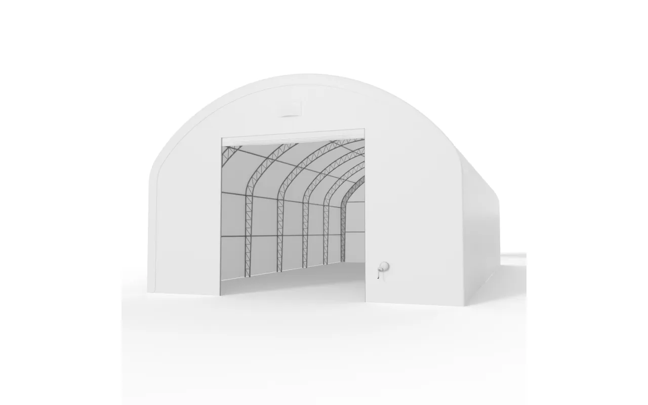 Plachtová hala s vertikálnymi bočnými stenami 9,15x18,3 m PVC 750 g/m² využíva oceľový rám v usporiadaní dvojbodovej priehradovej konštrukcie, ktorý zvyšuje tuhosť celku a uľahčuje bezpečnú prevádzku v premenlivých poveternostných podmienkach. Opláštenie z PVC plachty dostupné vo variante 750 g/m² (štandard) alebo 900 g/m² (zosilnené) zabezpečuje odolnosť voči dažďu, snehu, vetru aj UV žiareniu. Hala je vybavená mechanickou bránou ovládanou ručne, bez automatizácie, čo zjednodušuje používanie a znižuje riziko poruchy. Rozmer brány (šírka × výška): 4,27 x 4,5 m – parameter umožňuje prispôsobiť vjazd strojom a vozidlám používaným v prevádzke.