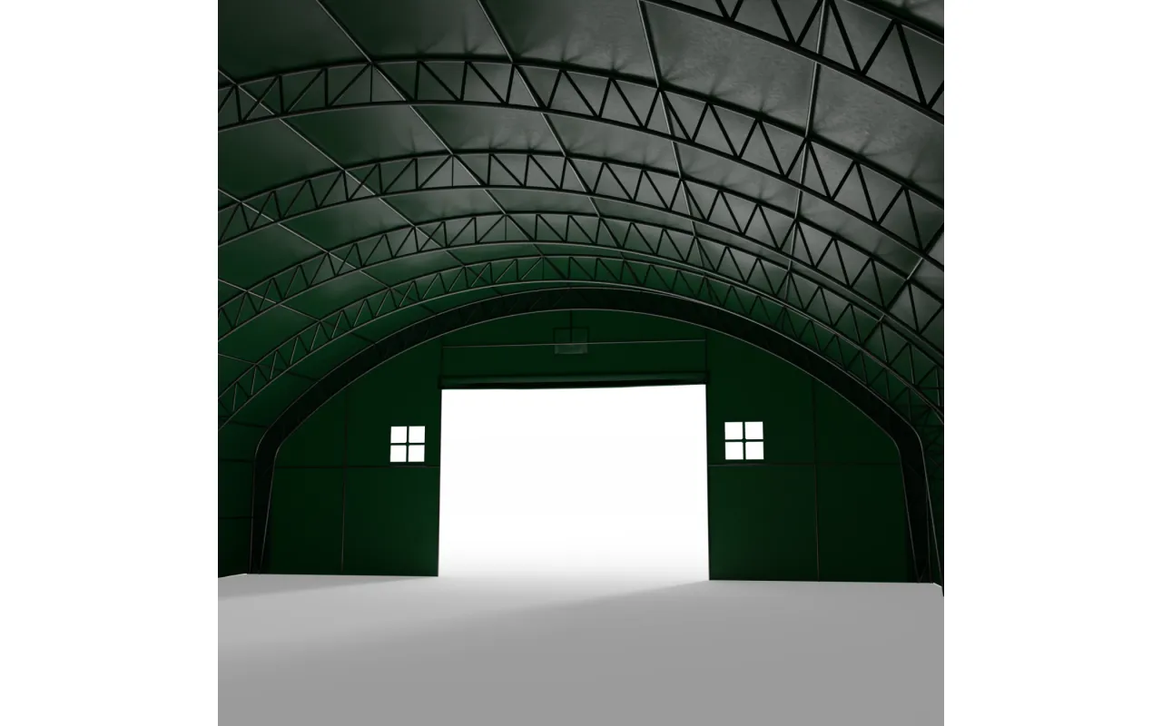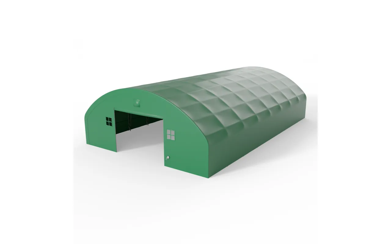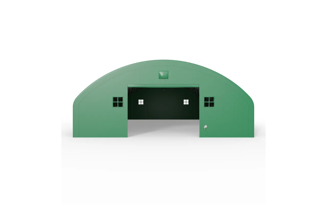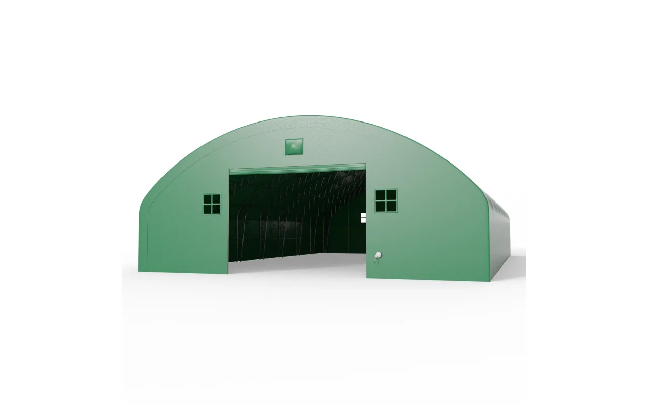 Zelený variant s dĺžkou 24,4 m je pripravený na prevádzku v poľnohospodárstve aj logistike. Oceľový rám tvorí stabilnú konštrukciu a plachta PVC 750 g/m² chráni interiér pred poveternostnými vplyvmi. Zvislé bočné steny umožňujú naplno využiť šírku haly a skladovať stroje, palety aj materiál bez obmedzení pri stenách. Porozprávajte sa s poradcom Gazelt o prispôsobení riešenia.