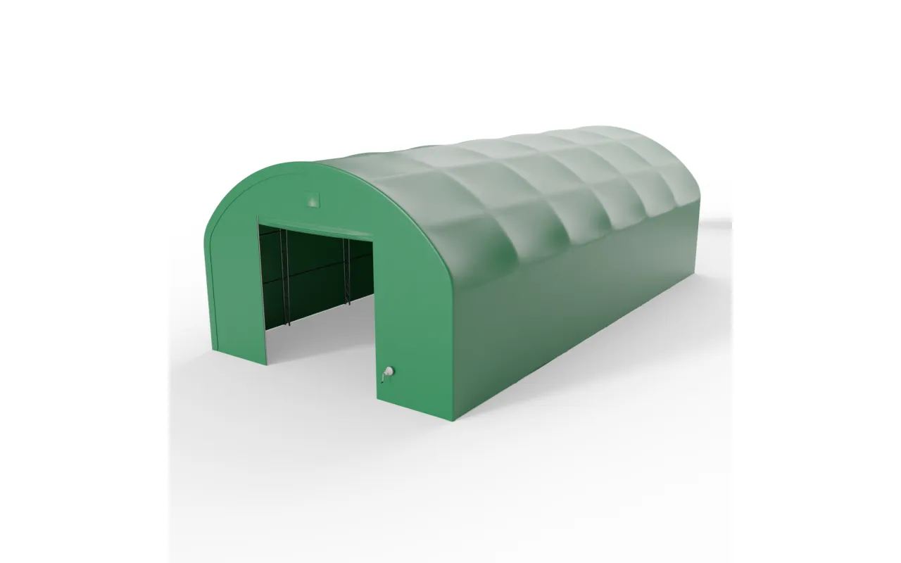 Plachtová hala s vertikálnymi bočnými stenami 9,15x24,4 m PVC 900 g/m² v zelenom vyhotovení je funkčný pracovný objekt určený na skladovanie, uskladnenie strojov a vykonávanie operatívnych činností. Kombinácia oblúkovej geometrie strechy so zvislými bočnými stenami umožňuje naplno využiť šírku konštrukcie bez vzniku nevyužitých zón pri bokoch. Vďaka pravidelnému tvaru interiéru je jednoduchšie rozmiestniť regály, techniku aj pracoviská a priestor funguje ako klasický sklad. Ide o riešenie pre poľnohospodárstvo, logistiku a priemysel – všade tam, kde má hala reálne podporovať každodennú prácu.