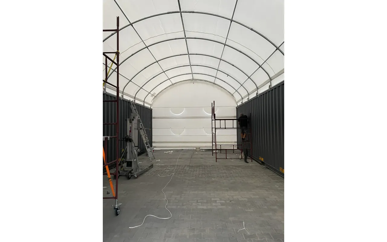 Konštrukcia Kontajnerové prestrešenie 6x6 m so zadnou stenou PVC 750 g/m² sa vyznačuje použitím nosných rúr a spojovacích prvkov so zväčšeným priemerom, čo vedie k zvýšeniu pevnostných parametrov celého systému. V skutočnosti je srdcom našej konštrukcie oceľ, a preto sme použili za studena valcovanú konštrukčnú oceľ. Okrem toho sú prvky kostry perforované, čím sa eliminujú zvarové spoje, pretože použitie tejto technológie zabezpečuje najvyššiu odolnosť konštrukcie voči statickým a dynamickým zaťaženiam a zabraňuje možným deformáciám. Na ochranu oceľových komponentov kontajnerových prístreškov sme ich podrobili procesu galvanického zinkovania. Táto metóda poskytuje komplexnú ochranu proti korózii v interiéri aj exteriéri. Vďaka tomu majú oceľové rúry vysokú odolnosť voči koróznym procesom. Systém strešných a bočných výstuh pozostáva z oceľových lán, čo zabezpečuje stabilitu konštrukcie, ktorá sa nedeformuje a zostáva pevná počas celého obdobia používania. Tento systém zároveň chráni plachtu pred tlakom snehu a vetra. Vnútorný napínací systém je kľúčový pre kontajnerové prístrešky, pretože udržuje materiál v napätí, čím zabraňuje vzniku záhybov a hromadeniu vody na povrchu plachty. Vďaka tomu je hala lepšie chránená pred nepriaznivými poveternostnými podmienkami, ako sú silný vietor alebo intenzívne zrážky. Tento systém tiež prispieva k estetike stanu, zabezpečujúc mu bezchybný a profesionálny vzhľad.