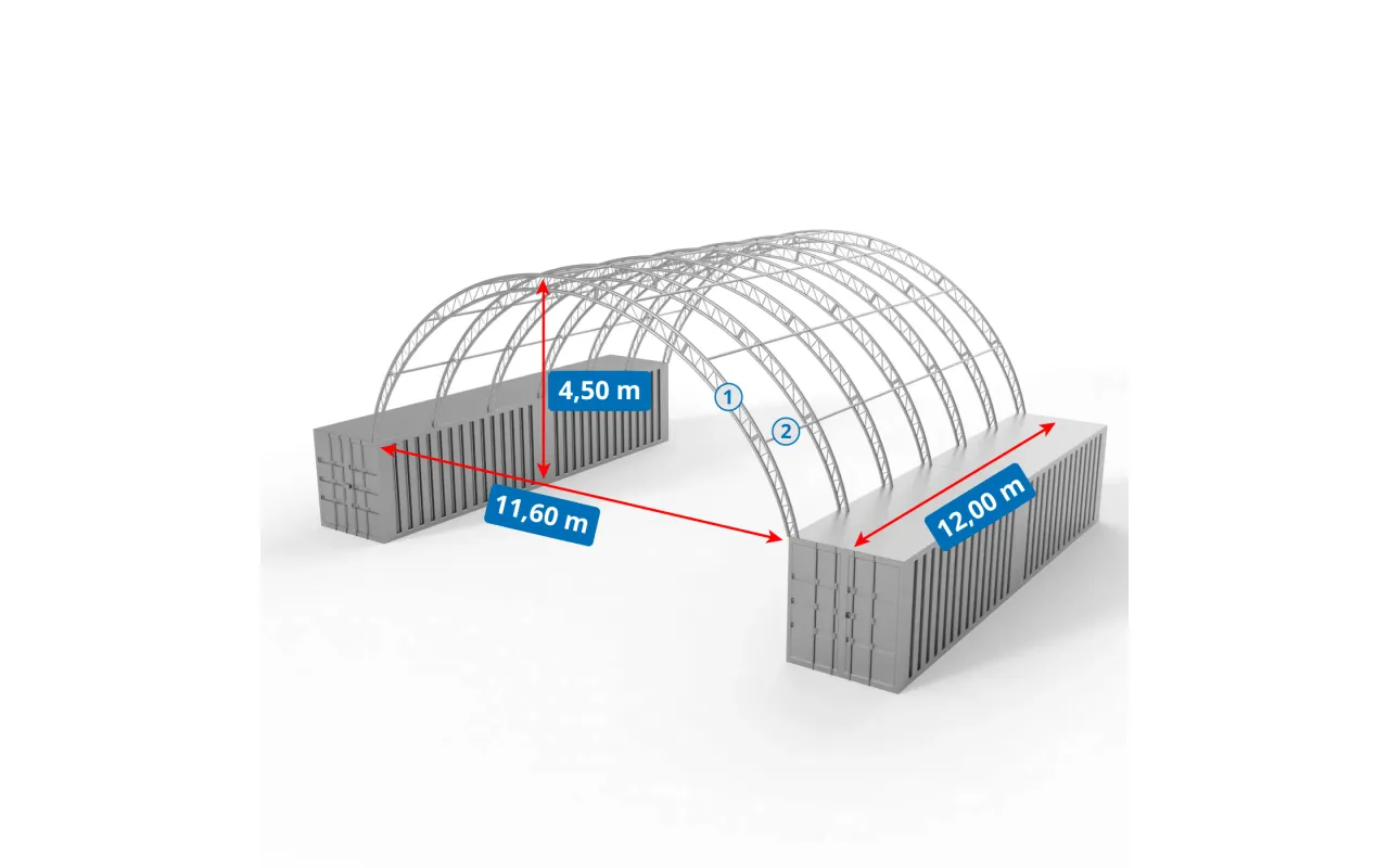 Kontajnerové prestrešenie 12x12 m je inovatívne stanové zastrešenie na ochranu priestoru medzi kontajnermi. Pre logistických spoločností, sklady aj stavenísk poskytuje stabilnú ochranu pred dažďom, snehom a intenzívnym slnkom. Vyhotovenie z odolného PVC materiálu je určené na dlhodobé nasadenie a vysokú bezpečnosť; modulová konštrukcia umožňuje rýchlu montáž na existujúce kontajnery. Voliteľne uzavrieme priestor zo všetkých strán a doplníme vjazdovú bránu alebo vstupné dvere. Požiadajte o ponuku na mieru.