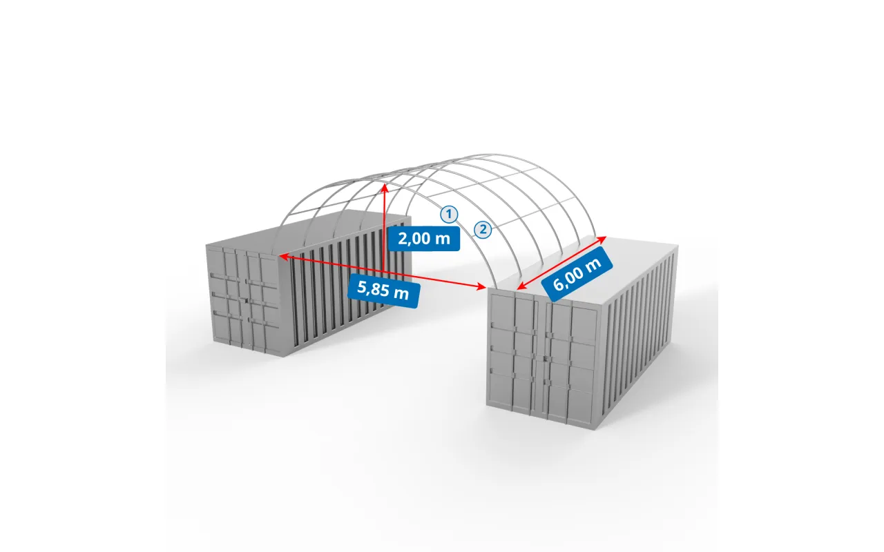 Kontajnerové prestrešenie 6x6 m je flexibilné a moderné stanové prekrytie navrhnuté na ochranu priestoru medzi kontajnermi. Je vhodné pre logistických spoločností, sklady aj stavenísk a poskytuje spoľahlivú ochranu pred dažďom, snehom a intenzívnym slnečným žiarením. Konštrukcia z odolného PVC materiálu s gramážou 900 g/m² je určená na dlhodobú prevádzku a vysokú odolnosť. Prestrešenia PVC vieme prispôsobiť – vrátane uzavretia z každej strany a doplnenia o vjazdovú bránu alebo vstupné dvere. Vyžiadajte si návrh a cenovú ponuku.