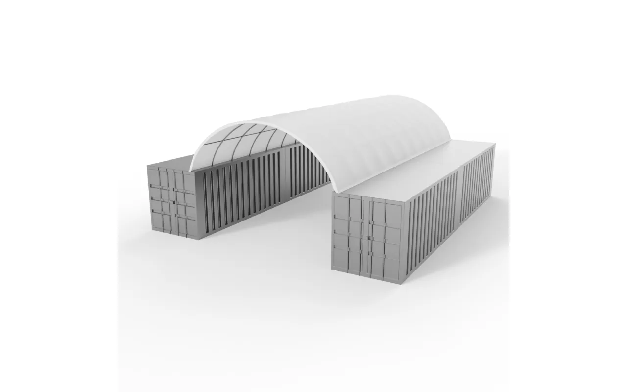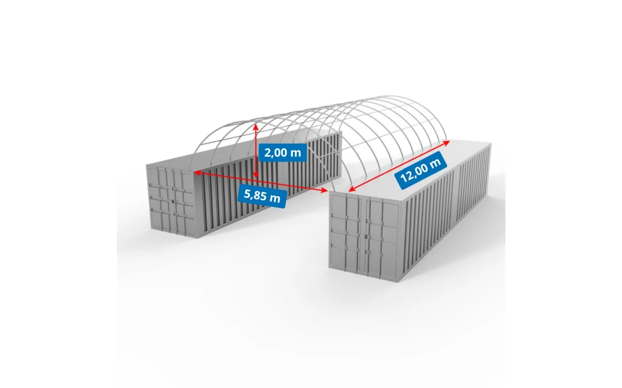 Kontajnerové prestrešenie 6x12 m je praktické prekrytie na ochranu priestoru medzi kontajnermi pre logistických spoločností, sklady aj stavenísk. Poskytuje spoľahlivú ochranu pred dažďom, snehom a intenzívnym slnkom. Vyhotovenie z odolného PVC materiálu s gramážou 900 g/m² je určené na dlhodobé používanie a vysokú odolnosť. Prestrešenia PVC vieme prispôsobiť: uzavretie zo všetkých strán, doplnenie o vjazdovú bránu alebo vstupné dvere. Tento variant obsahuje aj zadnú stenu, čo zvyšuje ochranu skladovaných materiálov. Kontaktujte nás a pripravíme riešenie na mieru.