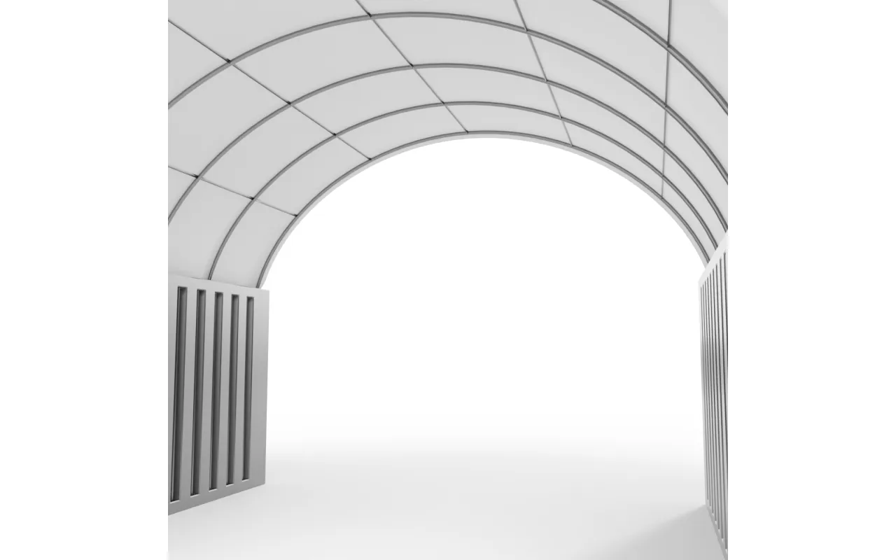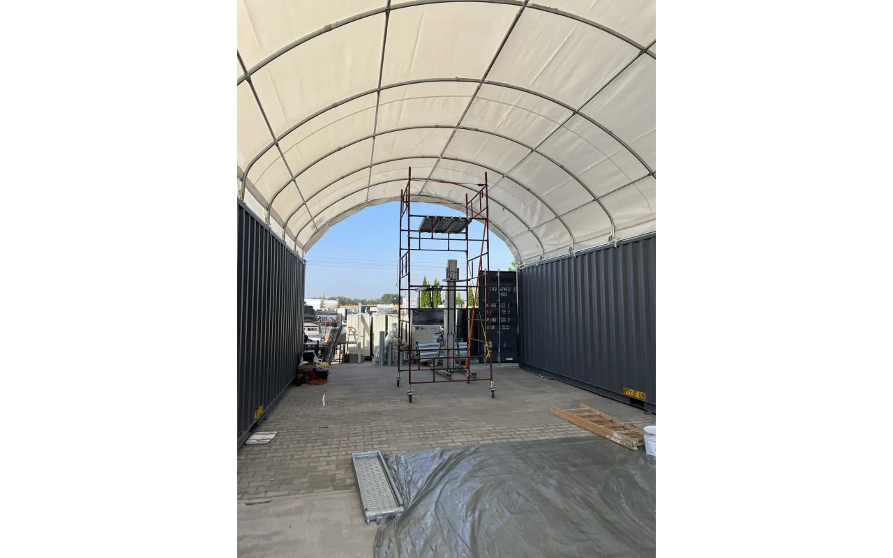 Konštrukcia Kontajnerové prestrešenie 6x12 m so zadnou stenou PVC 900 g/m² sa vyznačuje použitím nosných rúr a spojovacích prvkov so zväčšeným priemerom, čo vedie k zvýšeniu pevnostných parametrov celého systému. V skutočnosti je srdcom našej konštrukcie oceľ, a preto sme použili za studena valcovanú konštrukčnú oceľ. Okrem toho sú prvky kostry perforované, čím sa eliminujú zvarové spoje, pretože použitie tejto technológie zabezpečuje najvyššiu odolnosť konštrukcie voči statickým a dynamickým zaťaženiam a zabraňuje možným deformáciám. Na ochranu oceľových komponentov kontajnerových prístreškov sme ich podrobili procesu galvanického zinkovania. Táto metóda poskytuje komplexnú ochranu proti korózii v interiéri aj exteriéri. Vďaka tomu majú oceľové rúry vysokú odolnosť voči koróznym procesom. Systém strešných a bočných výstuh pozostáva z oceľových lán, čo zabezpečuje stabilitu konštrukcie, ktorá sa nedeformuje a zostáva pevná počas celého obdobia používania. Tento systém zároveň chráni plachtu pred tlakom snehu a vetra. Vnútorný napínací systém je kľúčový pre kontajnerové prístrešky, pretože udržuje materiál v napätí, čím zabraňuje vzniku záhybov a hromadeniu vody na povrchu plachty. Vďaka tomu je hala lepšie chránená pred nepriaznivými poveternostnými podmienkami, ako sú silný vietor alebo intenzívne zrážky. Tento systém tiež prispieva k estetike stanu, zabezpečujúc mu bezchybný a profesionálny vzhľad.