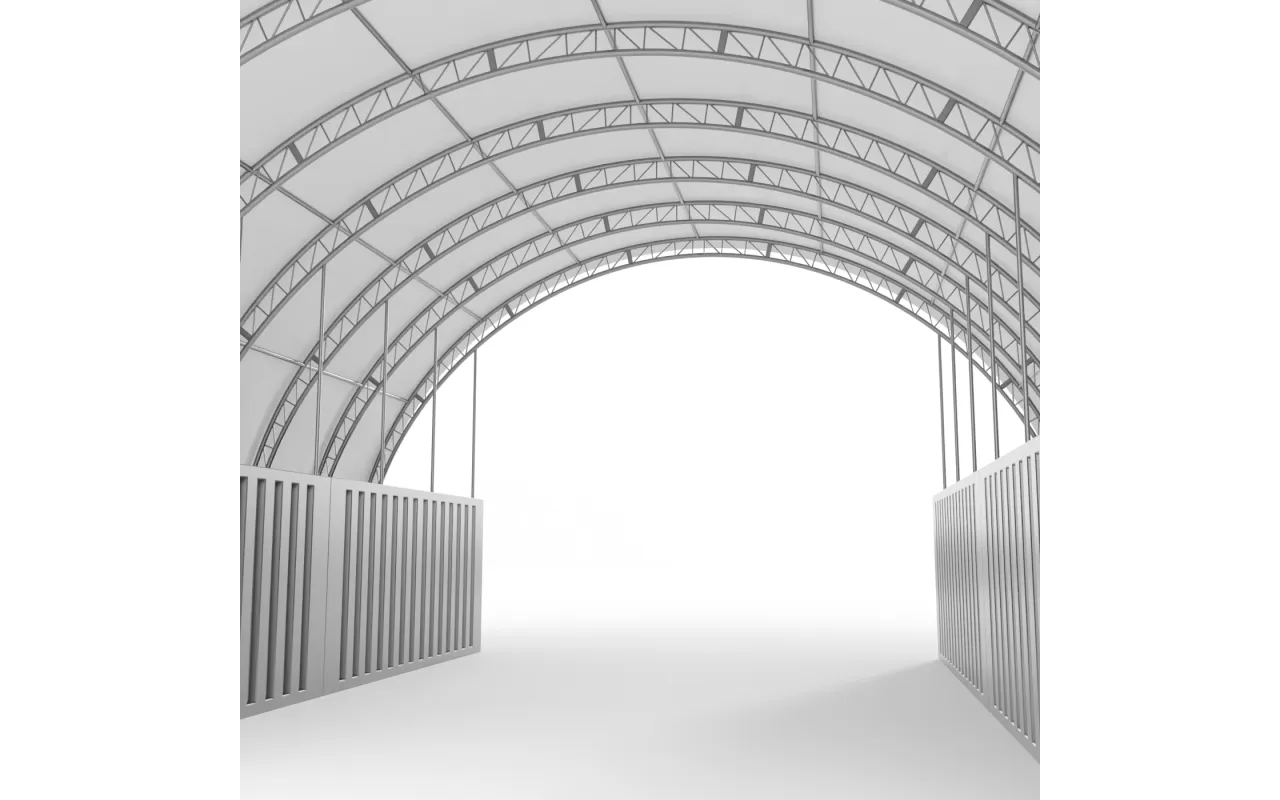 Konštrukcia Kontajnerové prestrešenie 21,35x12 m PVC 750 g/m² sa vyznačuje použitím nosných rúr a spojovacích prvkov so zväčšeným priemerom, čo vedie k zvýšeniu pevnostných parametrov celého systému. V skutočnosti je srdcom našej konštrukcie oceľ, a preto sme použili za studena valcovanú konštrukčnú oceľ. Okrem toho sú prvky kostry perforované, čím sa eliminujú zvarové spoje, pretože použitie tejto technológie zabezpečuje najvyššiu odolnosť konštrukcie voči statickým a dynamickým zaťaženiam a zabraňuje možným deformáciám. Na ochranu oceľových komponentov kontajnerových prístreškov sme ich podrobili procesu galvanického zinkovania. Táto metóda poskytuje komplexnú ochranu proti korózii v interiéri aj exteriéri. Vďaka tomu majú oceľové rúry vysokú odolnosť voči koróznym procesom. Systém strešných a bočných výstuh pozostáva z oceľových lán, čo zabezpečuje stabilitu konštrukcie, ktorá sa nedeformuje a zostáva pevná počas celého obdobia používania. Tento systém zároveň chráni plachtu pred tlakom snehu a vetra. Vnútorný napínací systém je kľúčový pre kontajnerové prístrešky, pretože udržuje materiál v napätí, čím zabraňuje vzniku záhybov a hromadeniu vody na povrchu plachty. Vďaka tomu je hala lepšie chránená pred nepriaznivými poveternostnými podmienkami, ako sú silný vietor alebo intenzívne zrážky. Tento systém tiež prispieva k estetike stanu, zabezpečujúc mu bezchybný a profesionálny vzhľad.