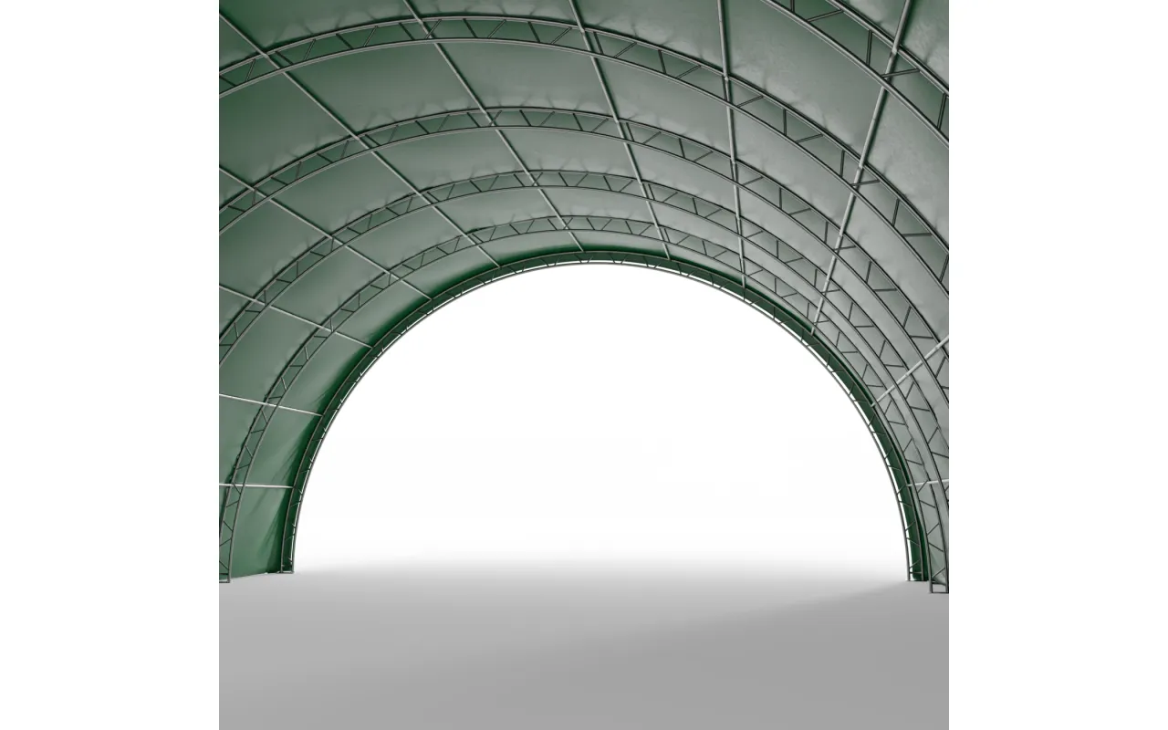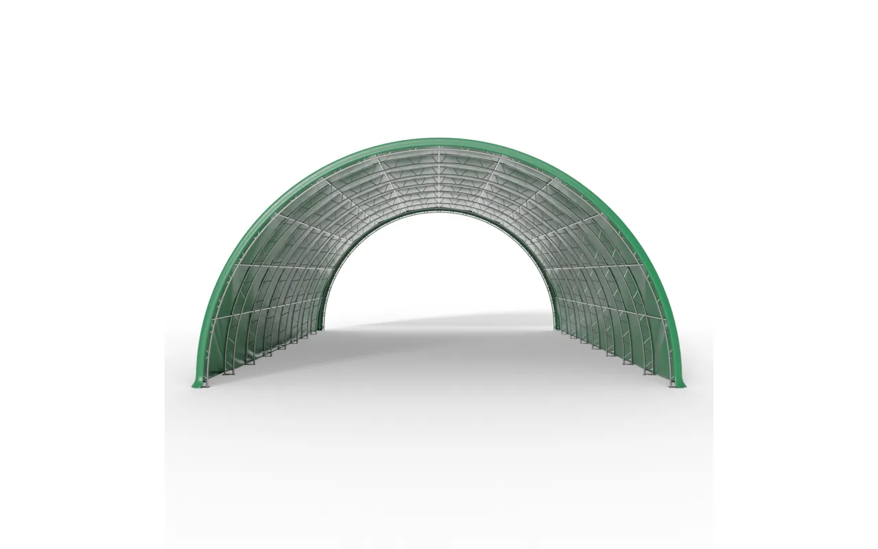 Oblúková hala 15,25x24,4 m PVC 900 g/m² v zelenom vyhotovení bola navrhnutá pre poľnohospodárske a chovateľské prevádzky, ako aj pre malé a stredné firmy, ktoré potrebujú spoľahlivý skladovací priestor. Ideálne slúži ako celoročný alebo sezónny prístrešok pre balíky sena a slamy, poľnohospodárske stroje, hnojivá či krmivá. Je tiež skvelým riešením na skladovanie úrody v big-bagoch, zeleniny, poľnohospodárskych plodín a zariadení, ktoré je potrebné chrániť pred dažďom, snehom alebo slnkom. Tunelový oblúk umožňuje efektívne využitie každého metra priestoru, umožňuje prejazd veľkých strojov bez nutnosti otvárať brány a zabezpečuje prirodzené prúdenie vzduchu. Vďaka otvorenej štítovej konštrukcii a širokým možnostiam konfigurácie môže Oblúková hala 15,25x24,4 m PVC 900 g/m² v zelenom vyhotovení plniť mnoho funkcií a jednoducho sa prispôsobiť meniacim sa potrebám hospodárstva.