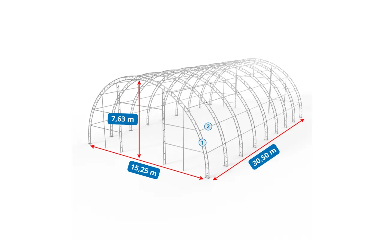 Konštrukcia stanu Zosilnená oblúková stanová hala 15,25x30,5m PVC 750g/m² vyniká použitím nosných rúrok a spojovacích prvkov so zväčšeným priemerom, čo priamo zvyšuje pevnostné parametre celého systému. Srdcom našej konštrukcie je oceľ, preto sme použili za studena valcovanú konštrukčnú oceľ. Prvky rámu sú navyše perforované, čím sa eliminujú zvary – táto technológia poskytuje najvyššiu odolnosť konštrukcie voči statickému aj dynamickému zaťaženiu a zabraňuje potenciálnym deformáciám. Na ochranu oceľových komponentov oblúkových stanov sme použili proces galvanického zinkovania, ktorý zaisťuje komplexnú antikoróznu ochranu v interiéri aj exteriéri. Vďaka tomu sú oceľové rúrky vysoko odolné voči korózii. Systém strešného a bočného napínania je tvorený oceľovými lankami, čo zabezpečuje stabilitu konštrukcie bez deformácií počas celej doby používania. Tento systém zároveň chráni plachtu pred tlakom snehu a vetra. Vnútorný systém napínania je kľúčovým prvkom v Zosilnená oblúková stanová hala 15,25x30,5m PVC 750g/m², pretože udržiava materiál napnutý a zabraňuje tvorbe záhybov a vodných kaluží na povrchu plachty. Vďaka tomu je hala lepšie chránená pred nepriaznivým počasím, ako je silný vietor alebo dážď. Tento systém zároveň prispieva k estetike stanu a zaisťuje mu upravený a profesionálny vzhľad.