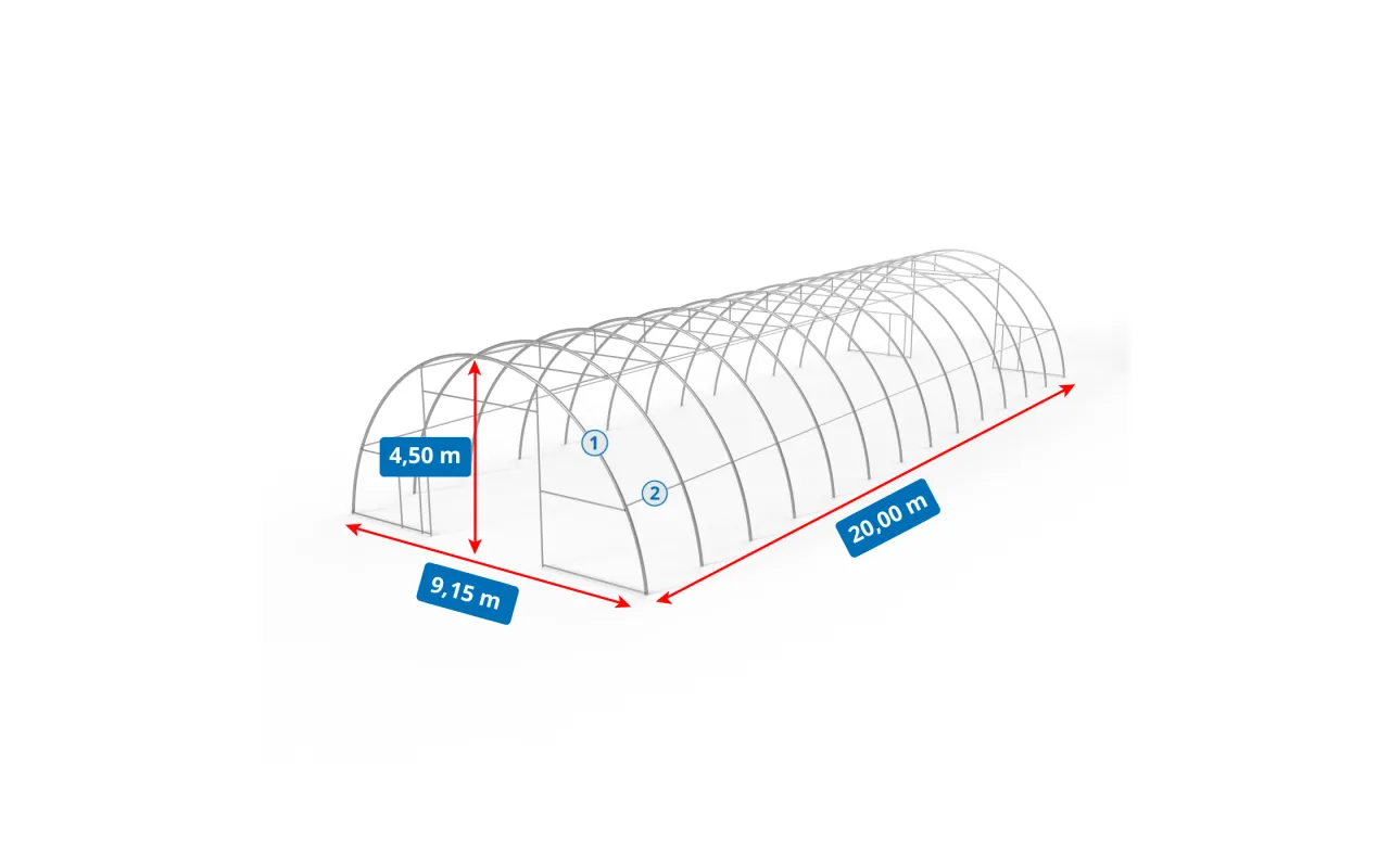 Konštrukcia stanu Plachtová hala 9,15x20 m PVC 750 g/m² v zelenom vyhotovení vyniká použitím nosných rúrok a spojovacích prvkov so zväčšeným priemerom, čo priamo zvyšuje pevnostné parametre celého systému. Srdcom našej konštrukcie je oceľ, preto sme použili za studena valcovanú konštrukčnú oceľ. Prvky rámu sú navyše perforované, čím sa eliminujú zvary – táto technológia poskytuje najvyššiu odolnosť konštrukcie voči statickému aj dynamickému zaťaženiu a zabraňuje potenciálnym deformáciám. Na ochranu oceľových komponentov oblúkových stanov sme použili proces galvanického zinkovania, ktorý zaisťuje komplexnú antikoróznu ochranu v interiéri aj exteriéri. Vďaka tomu sú oceľové rúrky vysoko odolné voči korózii. Systém strešného a bočného napínania je tvorený oceľovými lankami, čo zabezpečuje stabilitu konštrukcie bez deformácií počas celej doby používania. Tento systém zároveň chráni plachtu pred tlakom snehu a vetra. Vnútorný systém napínania je kľúčovým prvkom v Plachtová hala 9,15x20 m PVC 750 g/m² v zelenom vyhotovení, pretože udržiava materiál napnutý a zabraňuje tvorbe záhybov a vodných kaluží na povrchu plachty. Vďaka tomu je hala lepšie chránená pred nepriaznivým počasím, ako je silný vietor alebo dážď. Tento systém zároveň prispieva k estetike stanu a zaisťuje mu upravený a profesionálny vzhľad.