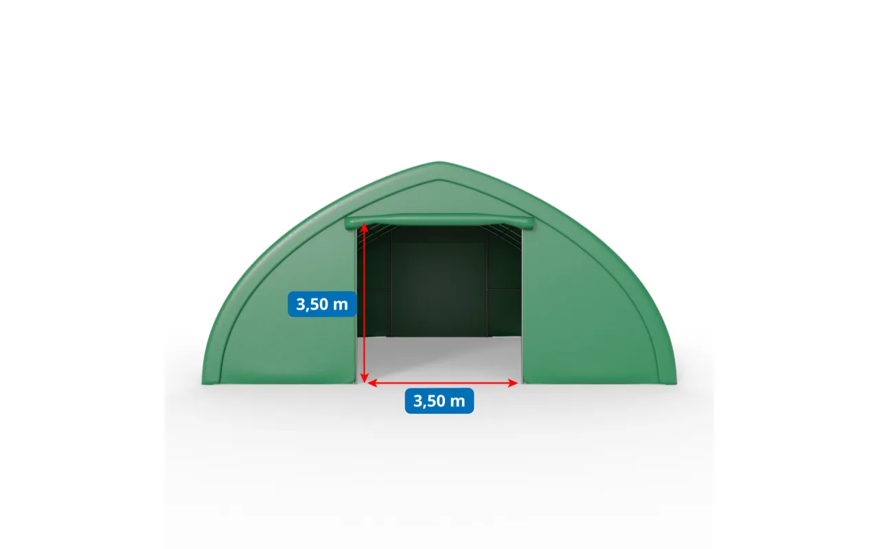 Zelená verzia haly 9,76×20 m je vhodná tam, kde je dôležitá funkčnosť aj estetika pracovného priestoru. Opláštenie z PVC plachty 750 g/m² v zelenej farbe zapadne do vidieckeho prostredia a zároveň chráni skladované materiály pred zrážkami, UV žiarením a vetrom. Oblúková oceľová konštrukcia zabezpečuje tuhosť a rolovacia brána ručne ovládaná na lano umožní rýchly prístup. Praktické riešenie na celoročnú prevádzku. Objednajte online alebo sa poraďte s poradcom.