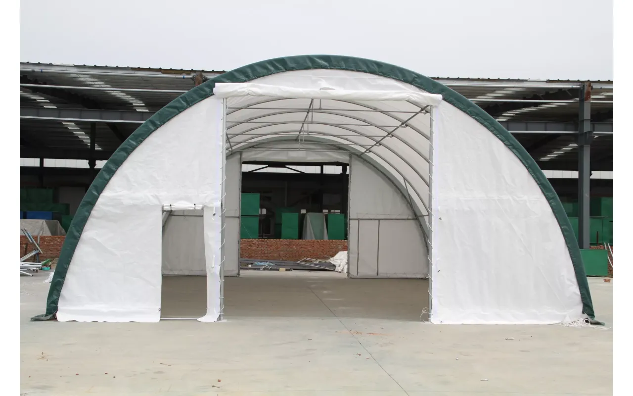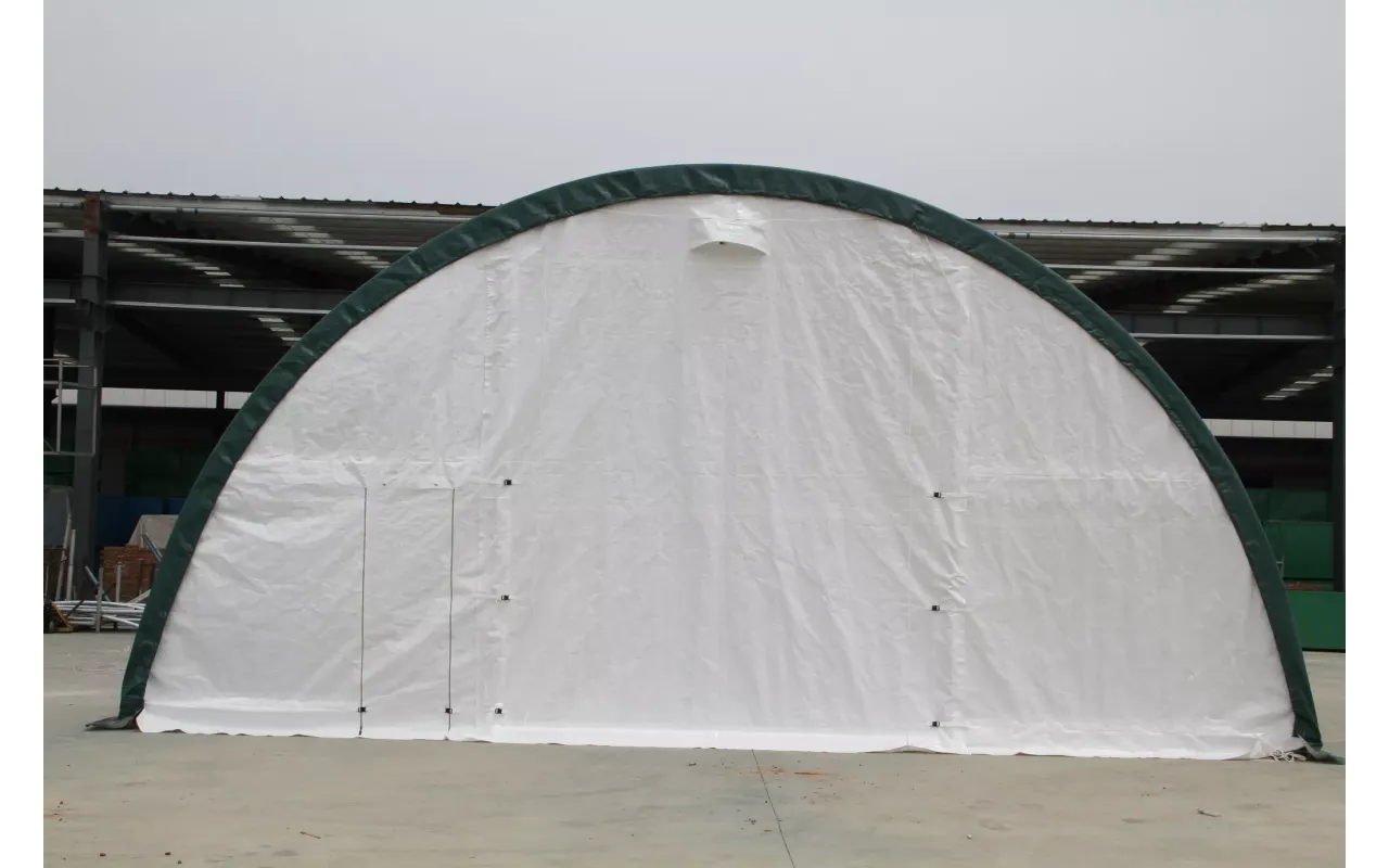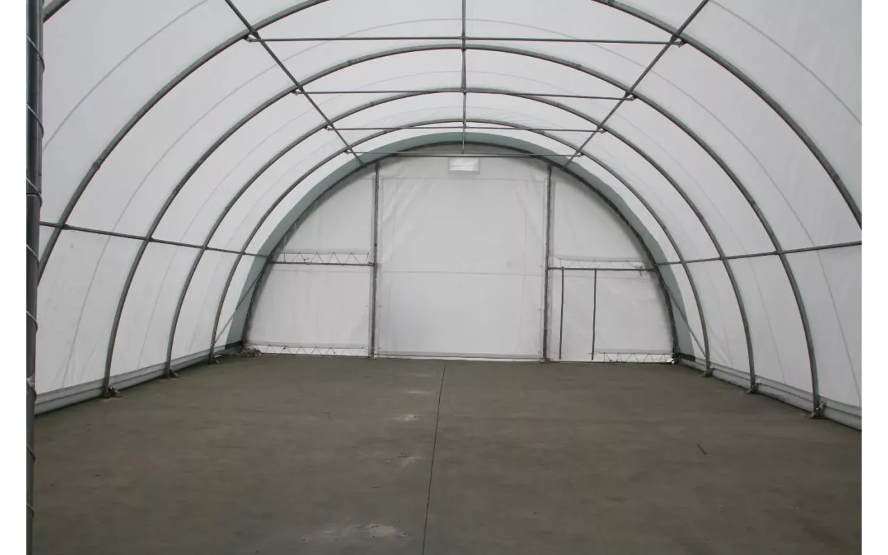 Model 9,15 × 12 m s bielou plachtou PVC 900 g/m² je zosilnená oblúková hala pre intenzívne používanie v meniacich sa poveternostných podmienkach. Materiál má vysokú odolnosť proti oderu a UV žiarenie, vďaka čomu sa hodí ako celoročné skladové alebo technické prestrešenie. Brána lano a plná zadná stena zabezpečia bezpečné uzavretie priestoru. Chcete vedieť reálny termín dodania? Kontaktujte nás a dostanete konkrétnu odpoveď.