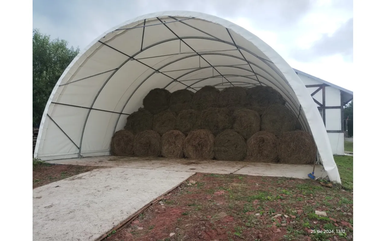 Plachtová hala Gazelt 9,15×12 m je overená voľba pre zákazníkov, ktorí potrebujú funkčný a odolný skladový priestor. Oválna oceľová konštrukcia a kryt z bielej plachty PVC 750 g/m² spoľahlivo chránia pred vetrom, zrážkami aj slnkom. Model má zadnú stenu a prednú stenu s bránou ovládanou ručne pomocou lana. Stabilné riešenie pre poľnohospodárstvo, lesníctvo aj menšie servisné prevádzky. Kontaktujte nás a overte si dostupnosť a dodacie podmienky pred objednávkou.
