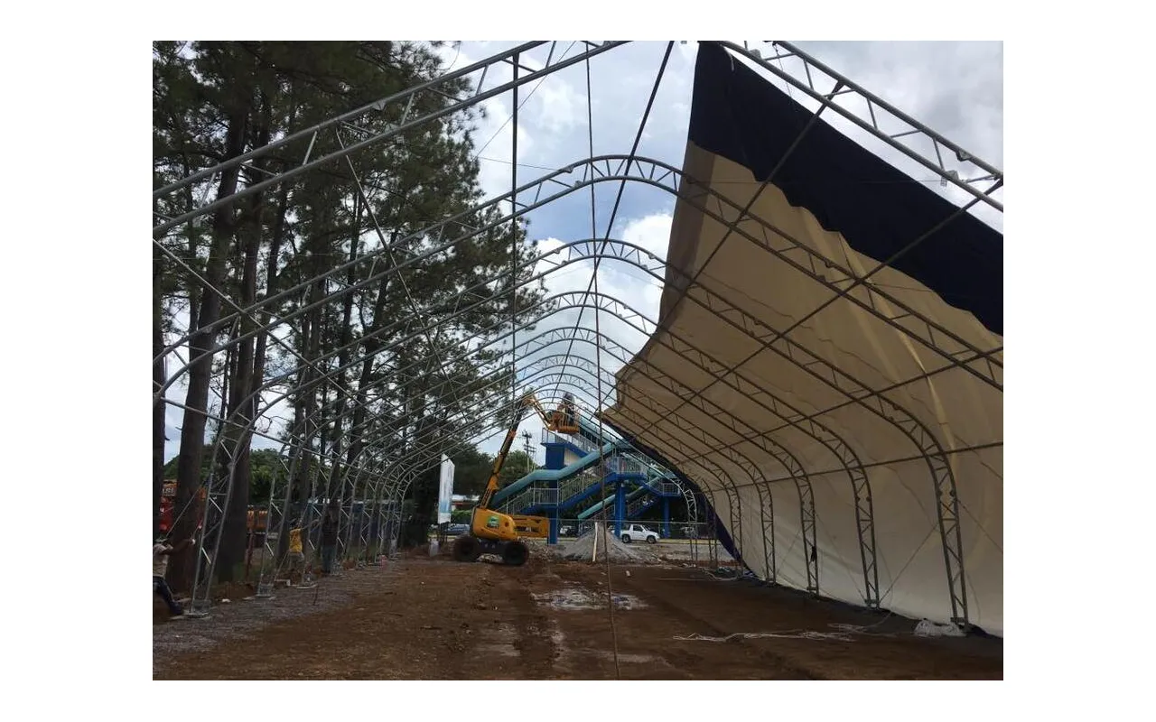 Konštrukcia stanu Stanová hala so sedlovou strechou 15,25x30,5 m PVC 900 g/m² sa vyznačuje použitím nosných rúrok a konektorov s väčším priemerom, čo znamená zvýšenie pevnostných parametrov celého systému. Oceľ je skutočne srdcom našej konštrukcie, preto sme použili konštrukčnú oceľ valcovanú za studena. Okrem toho sú prvky skeletu perforované, čím sa eliminujú zvary, pretože použitie tejto technológie vykazuje najväčšiu odolnosť konštrukcie voči statickému a dynamickému zaťaženiu a zabraňuje prípadným deformáciám. Na ochranu skeletu (stanové haly so šikmou strechou) sme oceľové prvky pozinkovali. Táto metóda poskytuje komplexnú ochranu proti korózii vo vnútorných aj vonkajších podmienkach. V dôsledku toho oceľové rúry vykazujú vysokú odolnosť voči procesom korózie. Strešný a bočný napínací systém pozostáva z oceľových lán. Výsledkom je stabilná konštrukcia, ktorá sa nedeformuje a zostáva kompaktná počas celej životnosti. Zároveň chráni plachtu pred tlakom snehu a vetra. Vnútorný napínací systém je v prípade Stanová hala so sedlovou strechou 15,25x30,5 m PVC 900 g/m² kľúčový, pretože udržiava materiál v napätí, čo zabraňuje tvorbe záhybov a vodných kaluží na povrchu plachty. Vďaka tomu je hala lepšie chránená pred nepriaznivými poveternostnými podmienkami, ako je silný vietor alebo dážď. Tento systém prispieva aj k estetickému vzhľadu stanu, pretože mu dodáva dokonalý a profesionálny vzhľad.