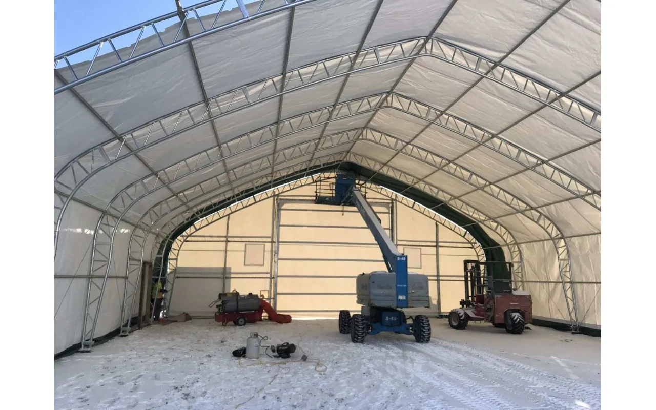 Konštrukcia stien haly so sedlovou strechou s vysokými bočnými stenami podporuje maximálne využitie skladovej plochy pri stenách. stanová hala so sedlovou strechou 15,25x45,75 m je praktické riešenie pre priemyselného odvetvia, poľnohospodárstvo aj skladovanie. strmá strešná konštrukcia zabezpečuje správny odvod snehu a dažďa a znižuje riziko poškodenia pri zaťažením extrémnym počasím. Vďaka jednoduchej montáži je vhodná na rýchle rozšírenie prevádzky. stanová hala so šikmou strechou 15,25x45,75 m je výborná voľba aj ako skladový stan.