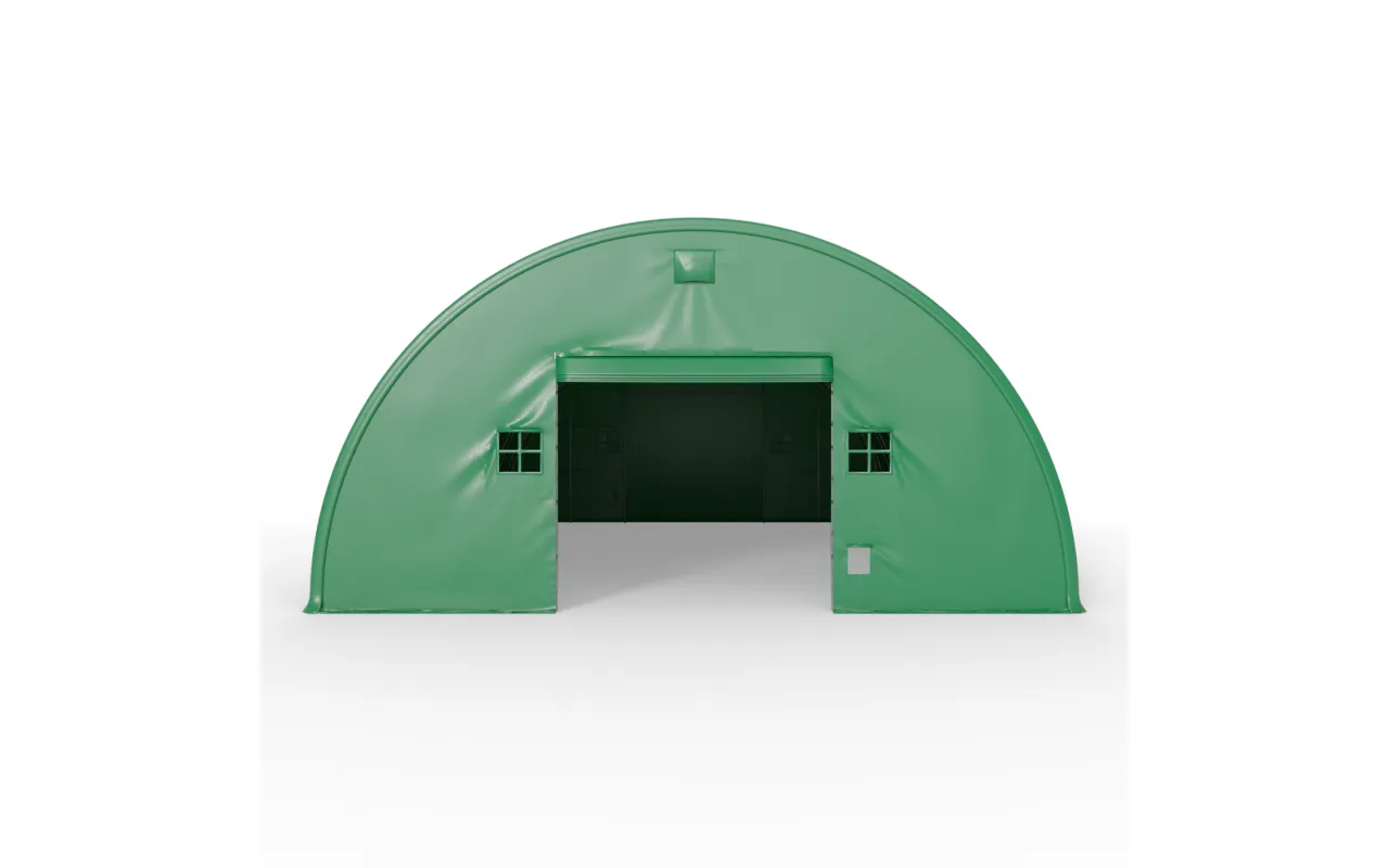 Obojstranná stena pre tunelovú halu v zelenom vyhotovení 15 m PVC 900 g/m² je konštrukčný prvok, ktorý umožňuje účinne uzavrieť oblúkovú halu z jednej alebo oboch strán – v závislosti od účelu objektu a potrieb používateľa. Čelné steny sú vybavené ručne ovládanou rolovacou bránou (s lanovým alebo kľukovým mechanizmom), ktorá umožňuje pohodlný vjazd strojov alebo prístup pešo. Zadné steny, ako plné priečky bez brány, chránia zadnú časť haly pred nepriaznivými poveternostnými podmienkami. [nazwa produktu] zabezpečuje ochranu interiéru pred vetrom, zrážkami a prachom a zároveň zvyšuje úžitkovú hodnotu konštrukcie tým, že zlepšuje organizáciu skladového priestoru a uľahčuje každodennú logistiku.