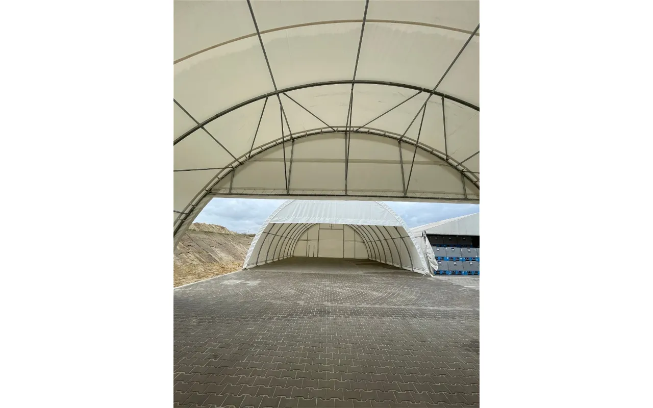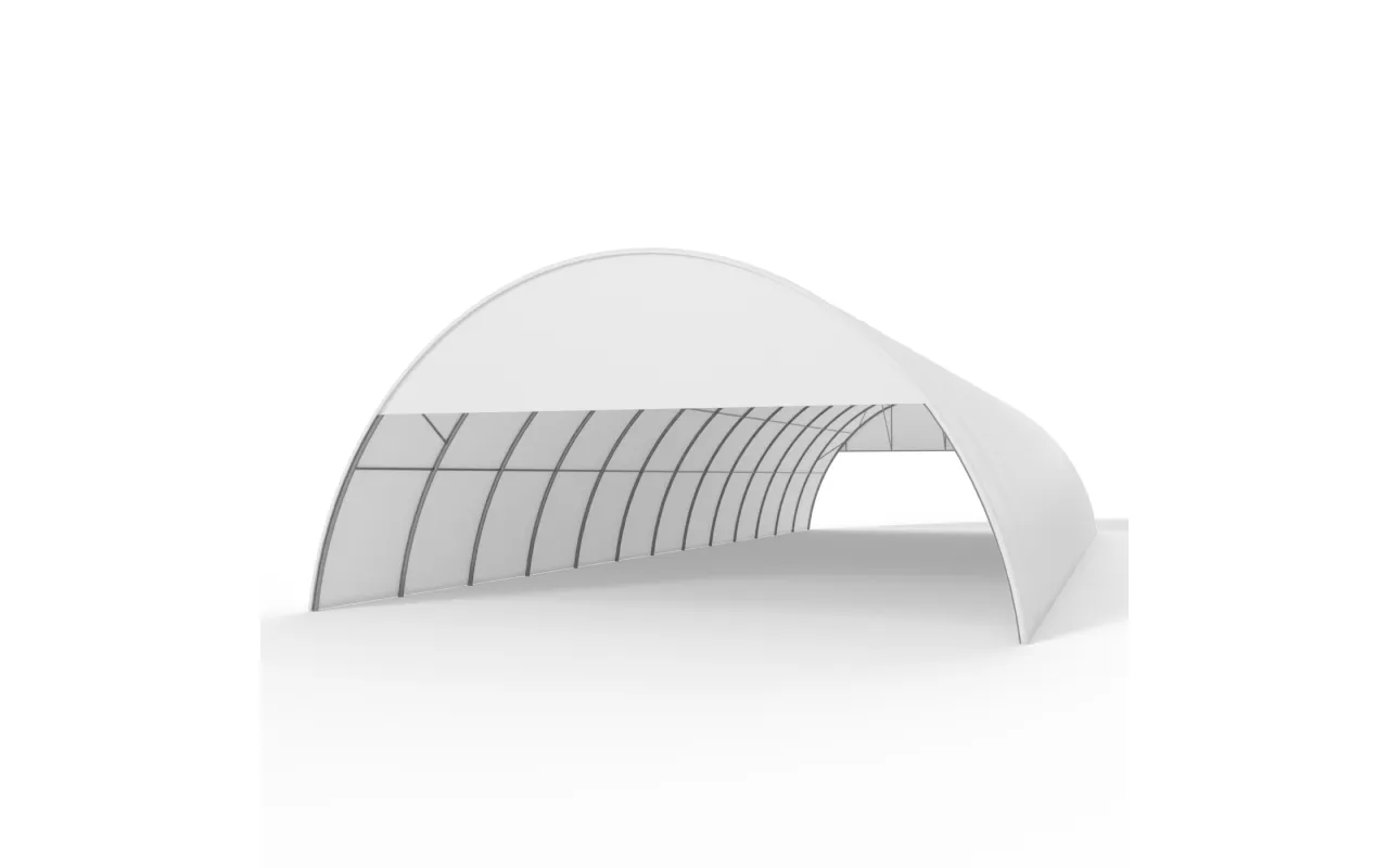 Štítový kryt s rámom pre oblúkovú halu 12 m PVC 900 g/m² je praktické riešenie na čiastočné zakrytie oblúkovej haly spredu alebo zozadu. Namiesto plnej steny chráni hornú časť štítu a zabezpečuje ochranu interiéru pred vetrom, dažďom a prachom. Tento typ riešenia je ideálny tam, kde chceme mať tovar v bezpečí, ale zároveň zachovať voľný prístup vzduchu alebo rýchly vstup do haly. Štítový kryt s rámom pre oblúkovú halu 12 m PVC 900 g/m² zvyšuje funkčnosť konštrukcie bez toho, aby obmedzovala jej flexibilitu – najmä pri sezónnom skladovaní úrody, strojov či stavebných materiálov.