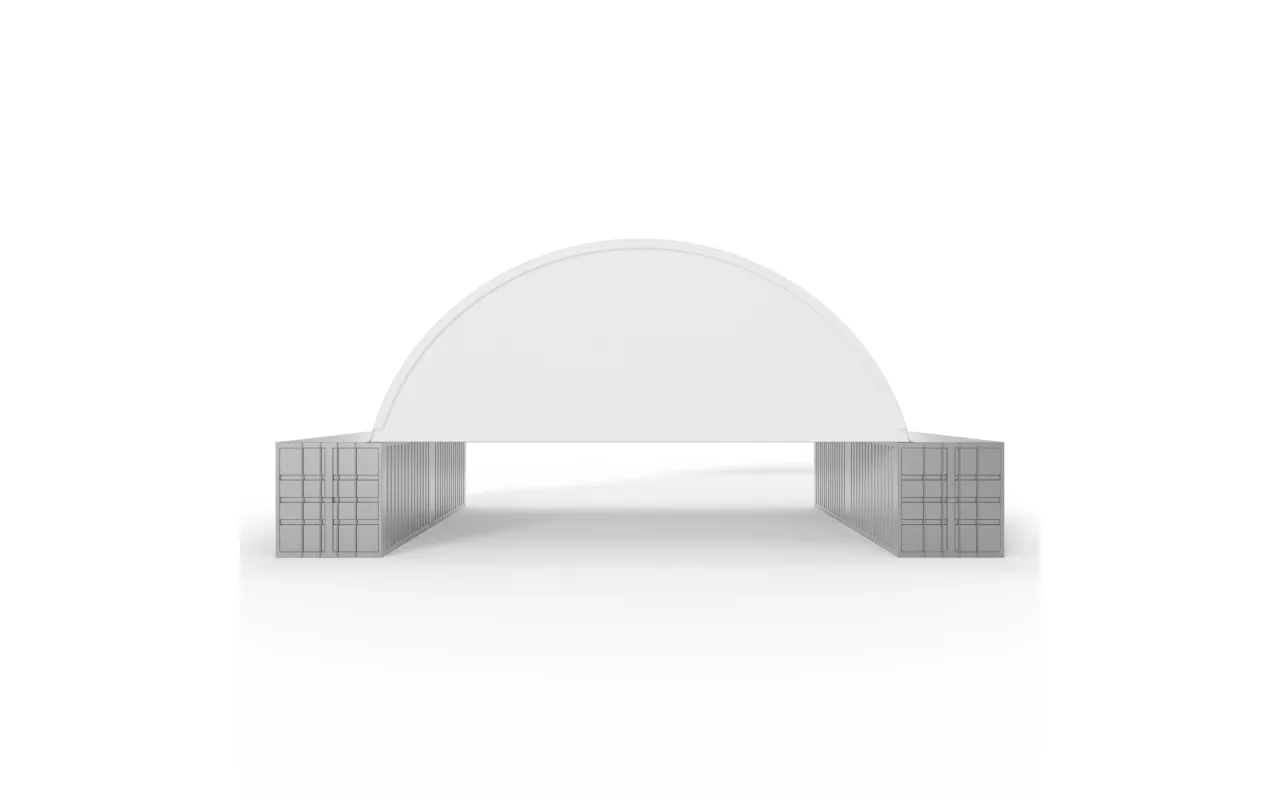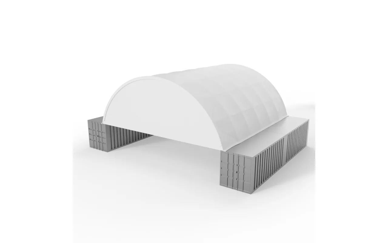 Štítový kryt so šírkou 12 metrov a opláštením PVC 750 g/m² je ekonomické riešenie pre veľké kontajnerové systémy. Oceľový rám zabezpečuje potrebné vystuženie a jednoduché prispôsobenie k oblúkovému tunelu Gazelt. Prvok montovaný z prednej alebo zadnej strany konštrukcie znižuje vplyv vetra a chráni skladovaný materiál pred zatečením. Riešenie je odporúčané pre sezónne sklady v poľnohospodárstve aj v servisných firmách.