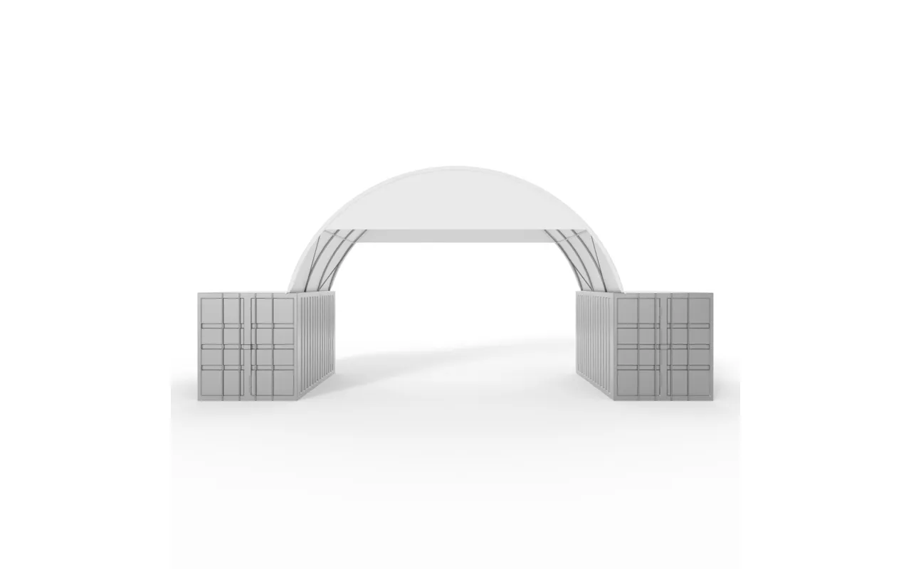 Štítový kryt čiastočné so šírkou 6 m a výškou 1 m je určené na čiastočnú ochranu oblúkovej konštrukcie pred vetrom a zrážkami. Plachta PVC 750 g/m² je ľahká, poskytuje základnú ochranu a zároveň zachováva dobrú priepustnosť vzduchu. Montuje sa od hornej hrany prestrešenia po polovicu oblúka a spevňuje štítovú zónu skladového tunela.